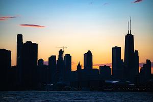 Chicago skyline from Lake Michigan at sunset
